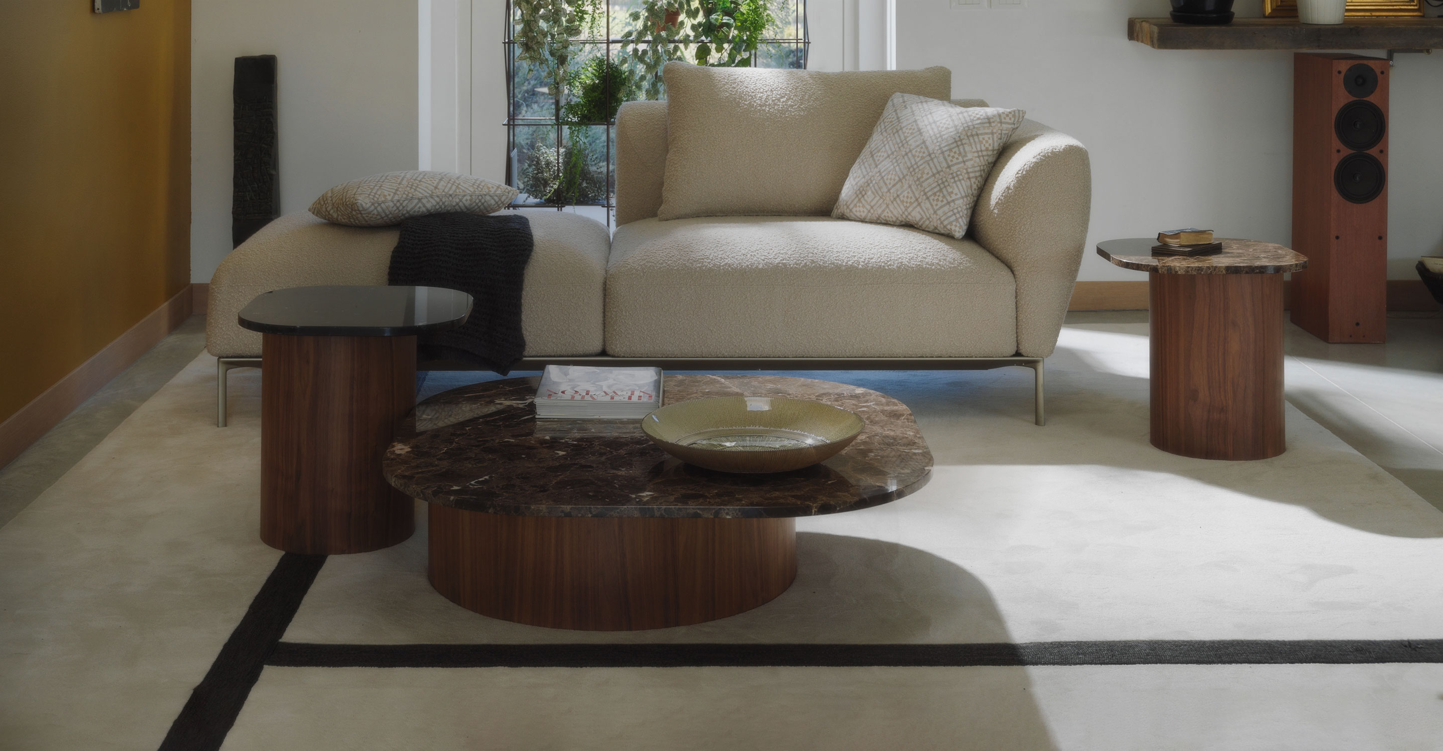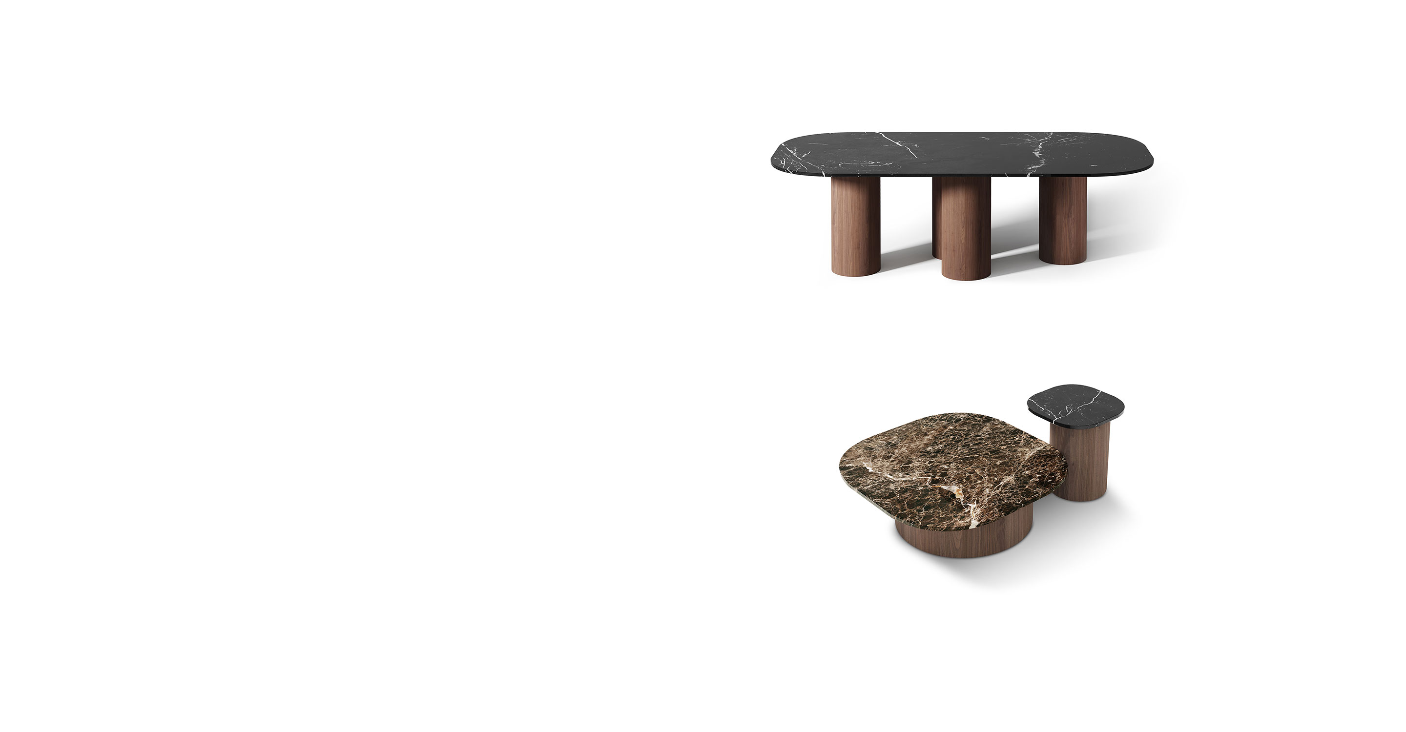 Renato Zamberlan designs a family of tables and coffee tables whose essence lies in the harmonious disproportion between cylindrical Canaletto walnut legs and a rigorous marble top.
