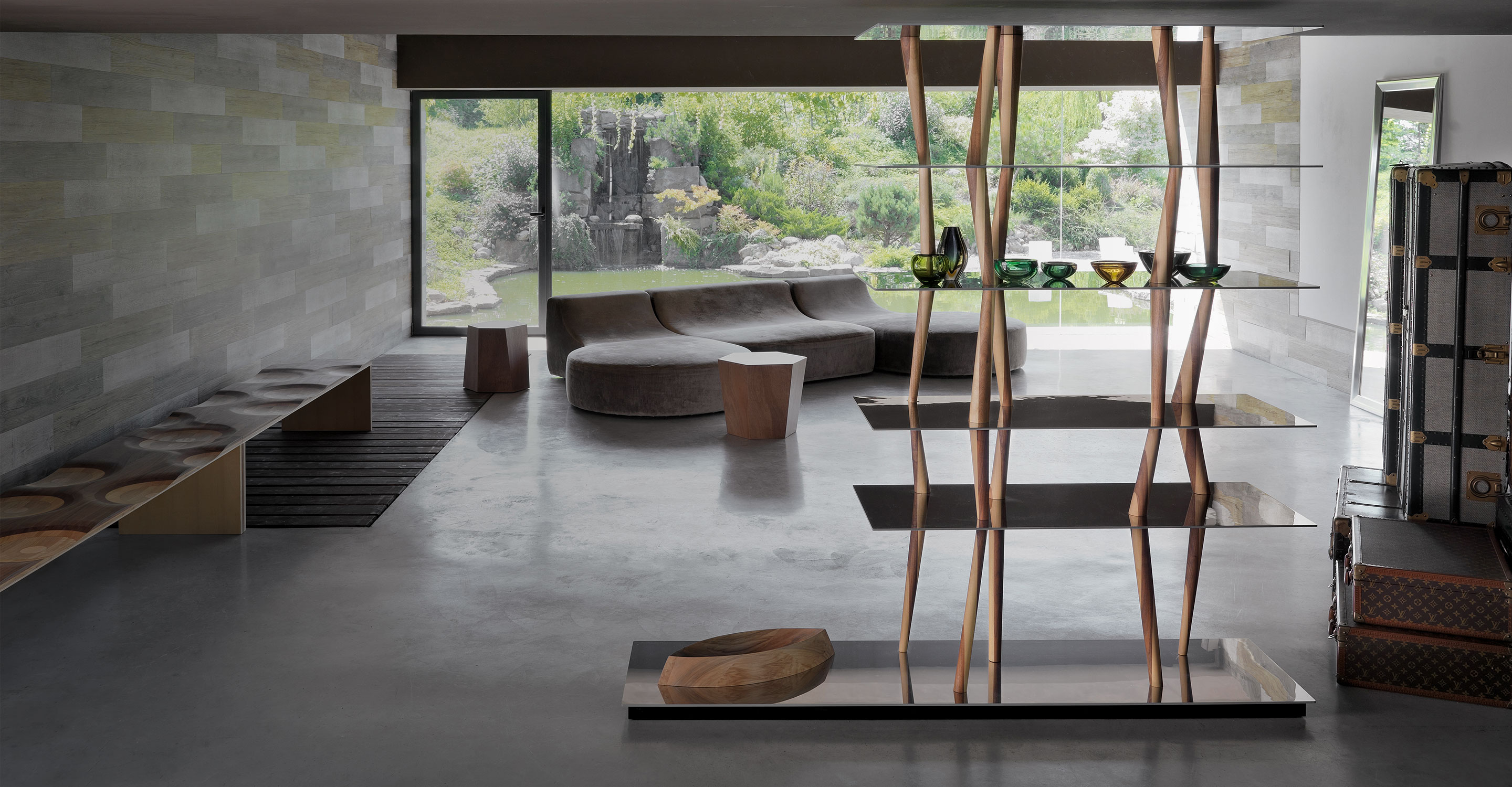 Sendai consists of six shelves, its structure is made of solid alder wood and Canaletto walnut, with wooden shelves covered in polished aluminium. The Crystal version introduces tempered glass for the shelves. This choice of design allows light to reflect, creating a play of movement and enhancing the geometry and volumes of the cabinet.